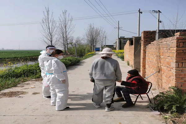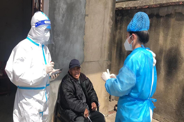 贺疃镇古路岗村:3月29日,贺疃镇古路岗村驻村工作队第一书记、队长苏矿业带领医护人员入户宣传疫情防控相关政策和疫情防控知识,同时上门为行动不便的老人做核酸检测,确保古路岗村顺利完成第一轮全村全员核酸检测工作。